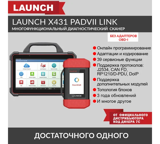 Launch X-431 PADVII Link - это флагман среди сканеров от компании Launch. Его можно охарактеризовать фразой - “Достаточно одного”. Сканер воплотил в себе самые передовые технологии Launch и в паре с мощнейшим железом позволит вам быть актуальным специалистом на годы вперёд. С его помощью вы сможете проводить не только стандартную диагностику, а также онлайн программирование, кодирование, ведомую диагностику и многое другое. Карта покрытия охватывает более 100 марок автомобилей и более 30 сервисных функций.