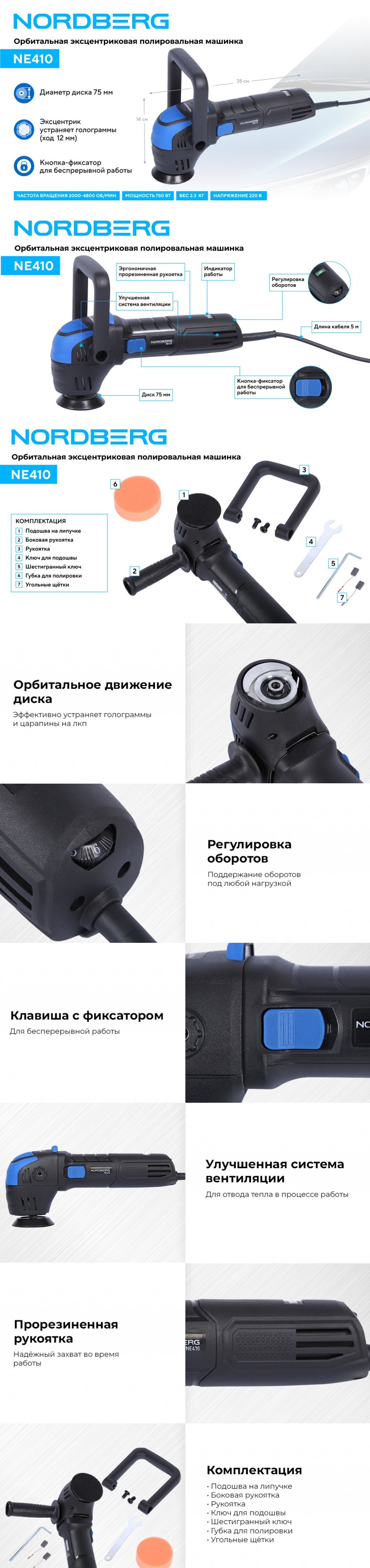Орбитальная полировальная машинка NORDBERG NE410 – электрический инструмент для выполнения профессиональных работ в автосервисах, студиях детейлинга и других предприятиях, занимающихся покраской.