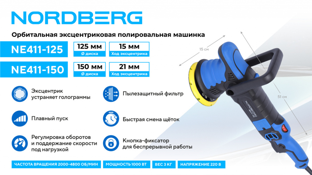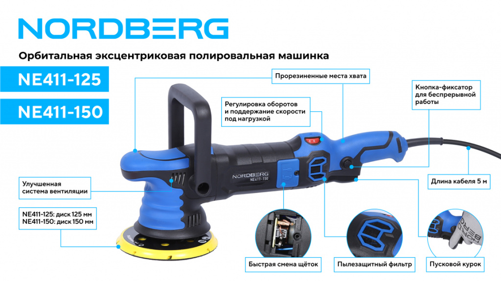 Орбитальная полировальная машинка NORDBERG NE411-125 – электрический инструмент для выполнения профессиональных работ в автосервисах, студиях детейлинга и других предприятиях, занимающихся покраской.