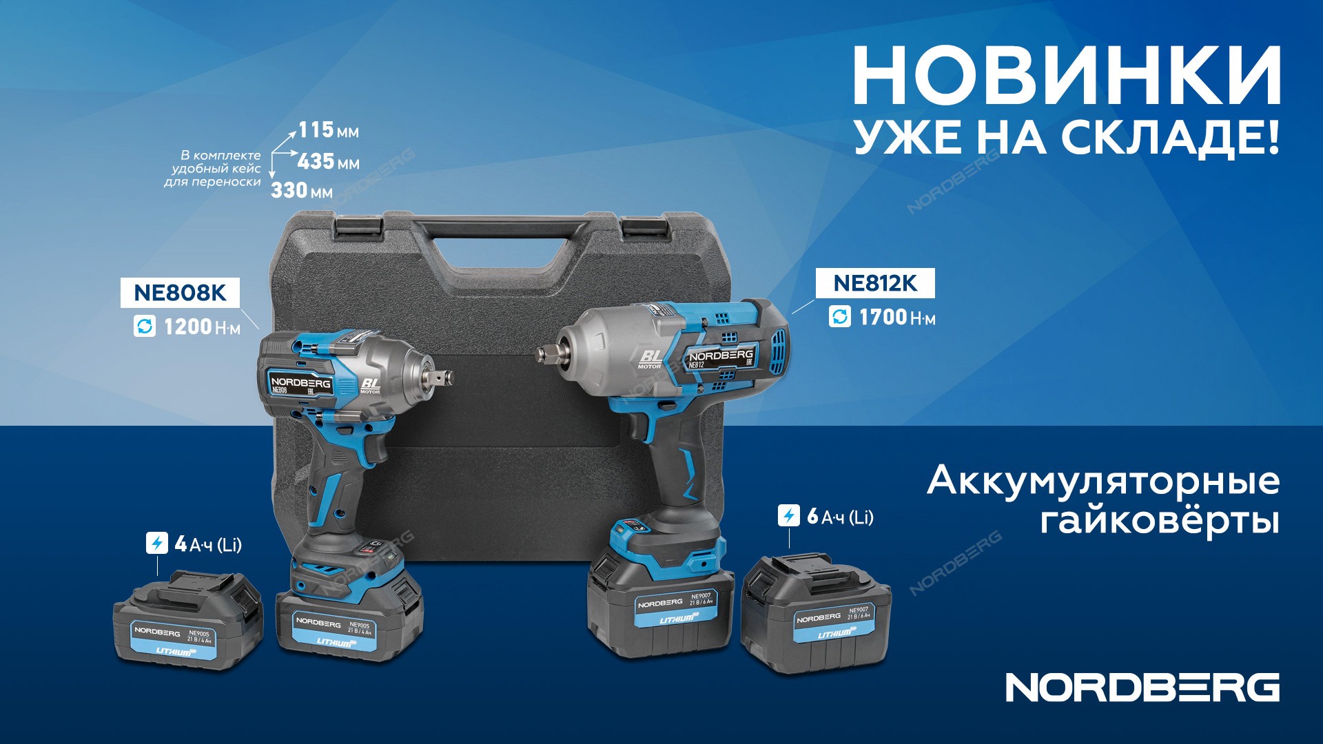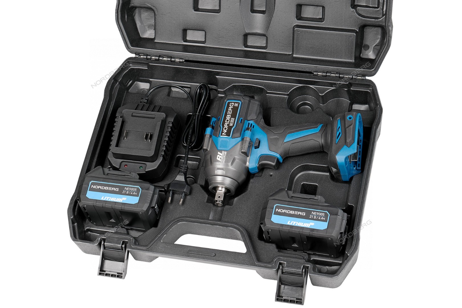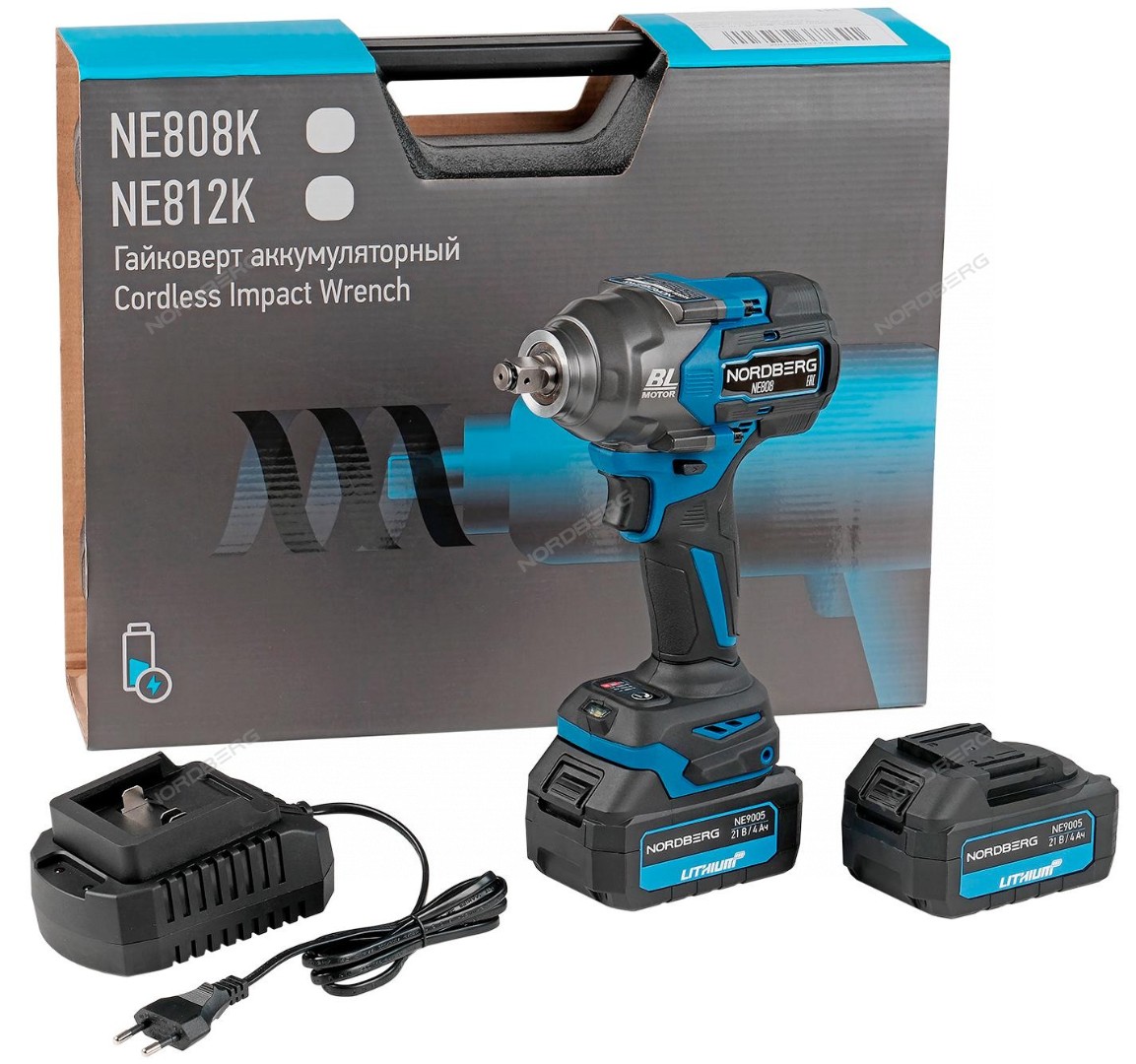 Гайковерт аккумуляторный, 1/2", 21В, 1200 Нм с двумя 4A акк. и зар. уст-вом 1,8A, в кейсе NORDBERG NE808K характеристики