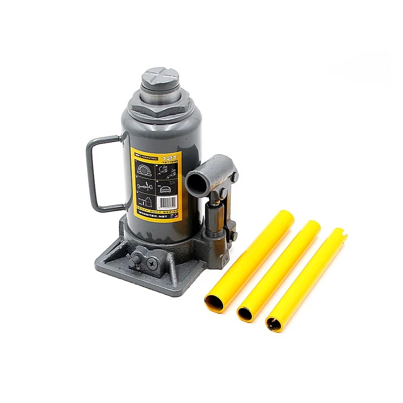 Гидравлический бутылочный домкрат Y411200 голландской фирмы Winntec предназначен для подъёма автомобилей и других грузов массой до 12 тонн. Домкрат Y411200 имеет один шток и состоит из трёх основных частей: стальной корпус с опорной площадкой, гидравлический цилиндр с поршнем, плунжерный насос с ручным рычагом. Его работа основана на принципе перемещения масла между сообщающимися сосудами разного сечения: если применить силу к одному поршню с помощью насоса, меняется давление масла в рабочем цилиндре и второй поршень с грузом поднимается.