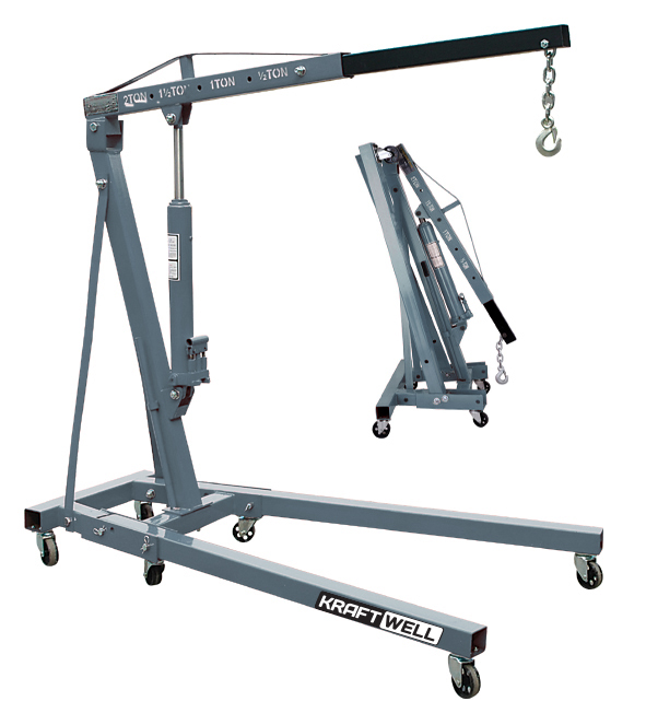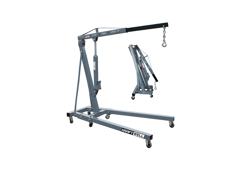 Гидравлический гаражный кран KRAFTWELL, модель KRWC2 максимальной грузоподъемностью 2000 кг имеет выдвижную стрелу, вылет которой регулируется путем ее перемещения вперед и назад с последующей фиксацией в одном из четырех положений. Каждому положению стрелы соответствует своя грузоподъемность, указанная на неподвижной части стрелы. Отличительной особенностью и главным конкурентным преимуществом крана KRWC2 является двухтактный гидравлический насос, работающий на подъем стрелы при движении рукоятки как вверх, так и вниз. Это обеспечивает увеличенную скорость и эффективность подъема по сравнению с аналогичными кранами, оснащенными однотактными насосами. Предохранительный клапан, встроенный в насос, защищает от превышения максимальной нагрузки. Тем самым исключается выход из строя насоса, при попытке поднять груз весом, превышающим максимально возможный. Максимальная высота подъема при полностью выдвинутой стреле составляет 2 метра 38 сантиметров. Конструкция основания крана имеет поворотные колеса, что делает его маневренным. Высота основания 180 мм позволяет закатить кран под кузов максимально близко к автомобилю. В сложенном состоянии кран не занимает много места, обеспечивая удобство его хранения в нерабочем состоянии.