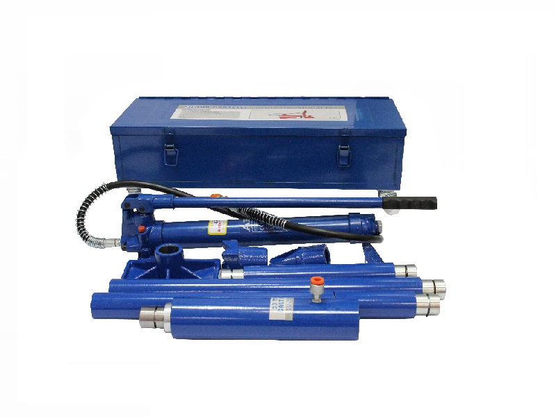 В комплект входят:насос гидравлический со шлангом, гидравлический цилиндр, удлинители, подставка, насадки.