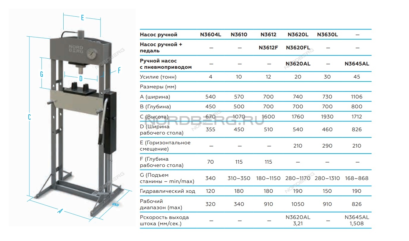 Пресс гидравлический, напольный, (20 тонн) NORDBERG N3620L характеристики