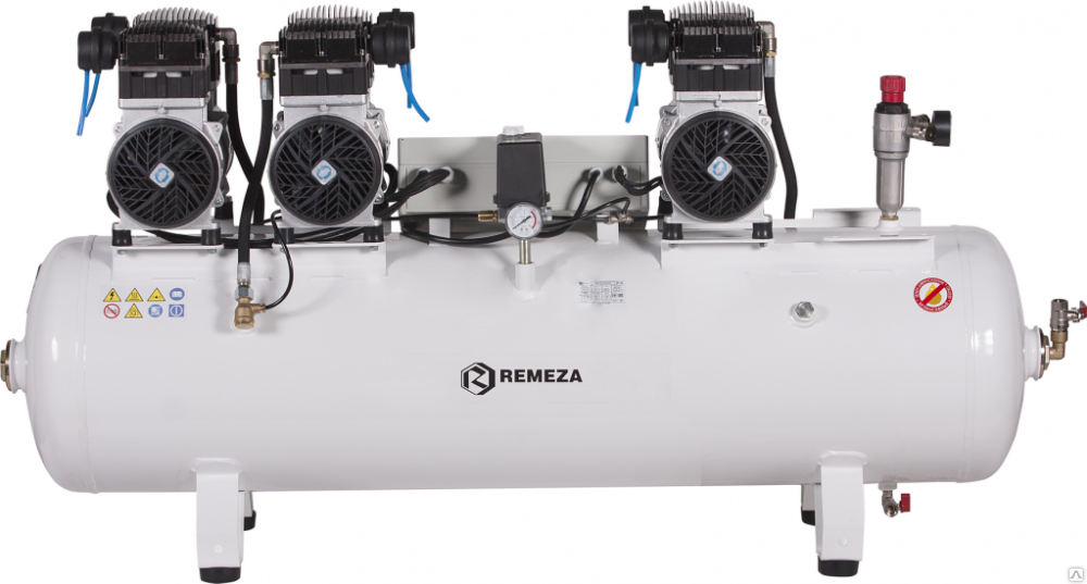 Компрессор имеет три поршневых блока (тандем) на одном ресивере - это позволяет увеличить производительность в 3 раза.