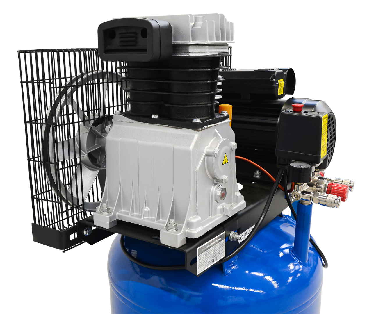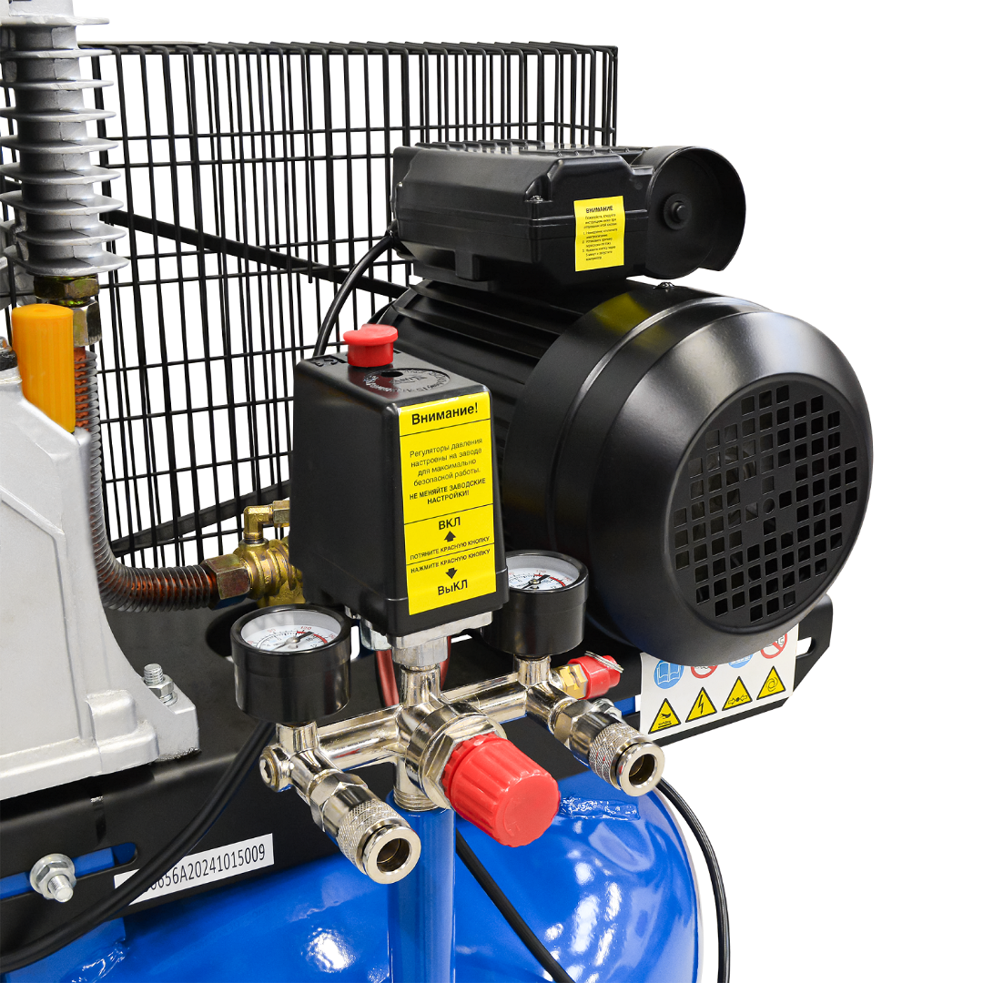 - Компрессорная головка с 2 цилиндрами, установленная на 100-л ресивере;