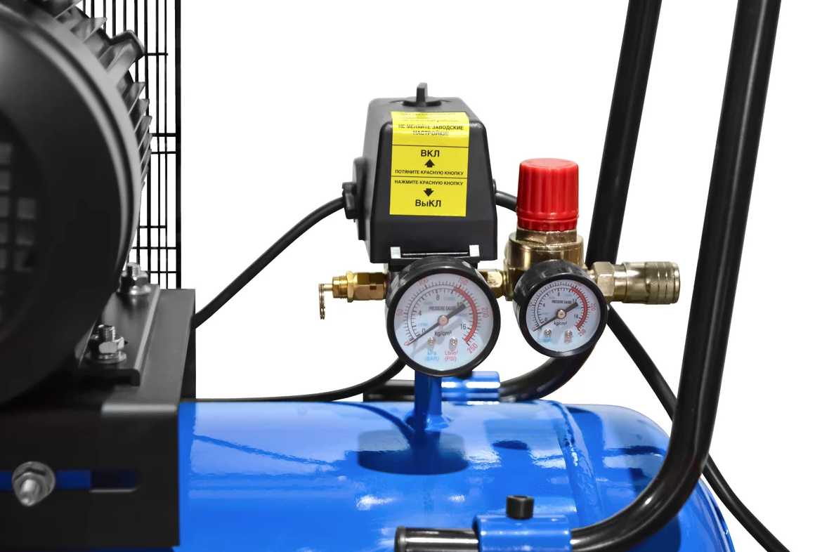 - Компрессорная головка с 2 цилиндрами, установленная на 100-л ресивере;