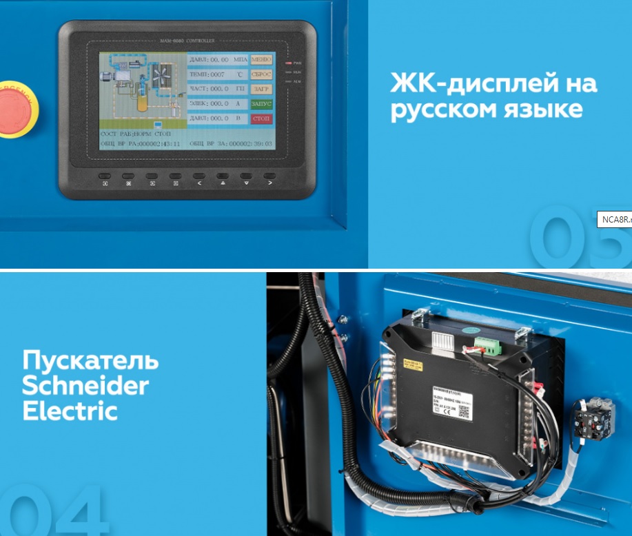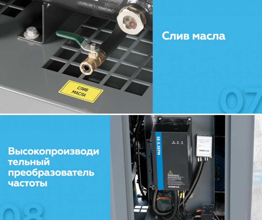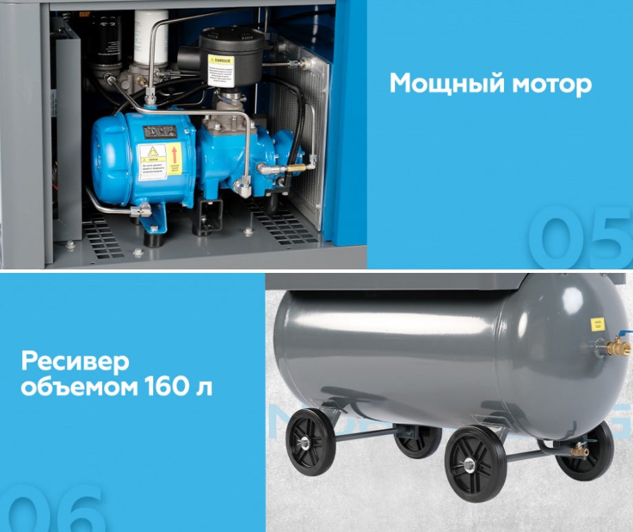 - Высокая производительность по сравнению с поршневыми компрессорами - более 90% КПД