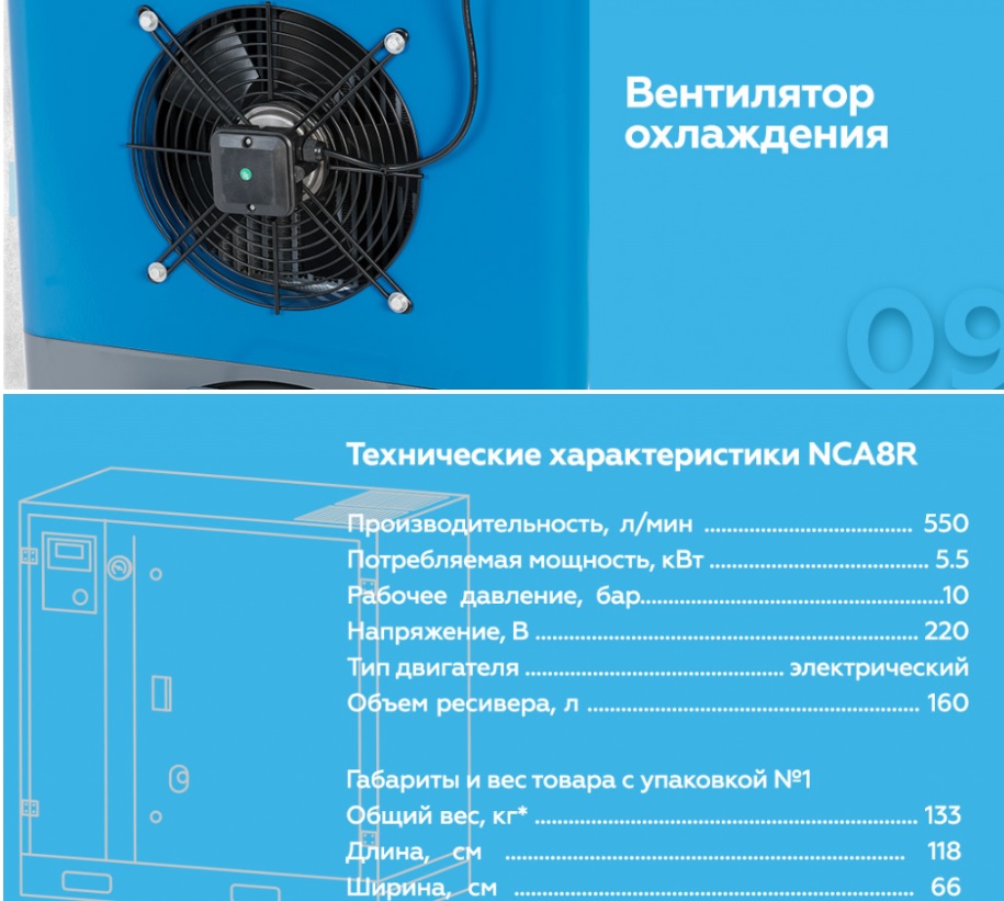 Компрессор винтовой, 5,5 кВт, 10 бар, 550 л/мин, ресивер 160 л, IP65 Nordberg NCA8R характеристики
