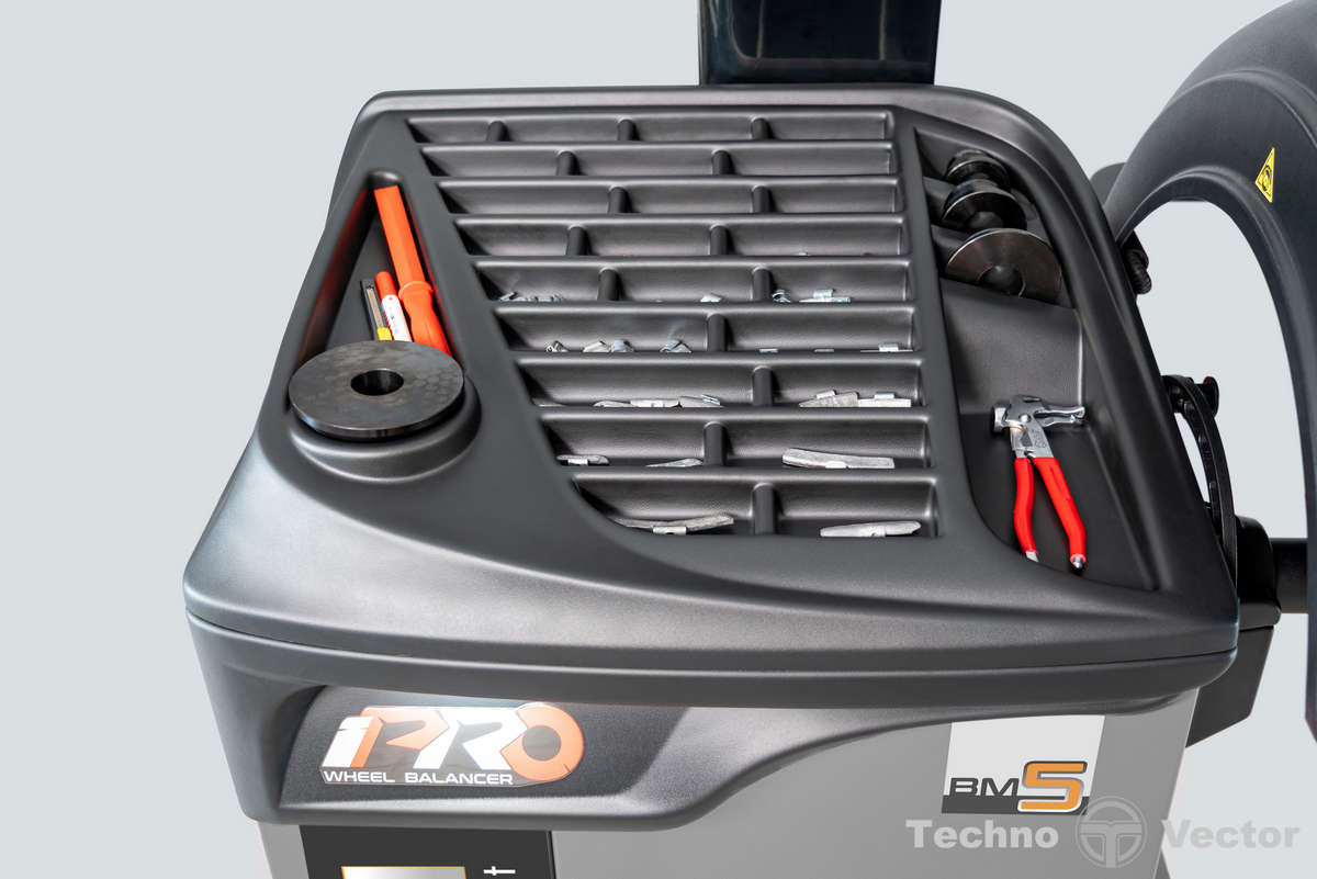 - Основная рабочая поверхность содержит 30 универсальных ячеек для хранения балансировочных грузов, конусов и других приспособлений.