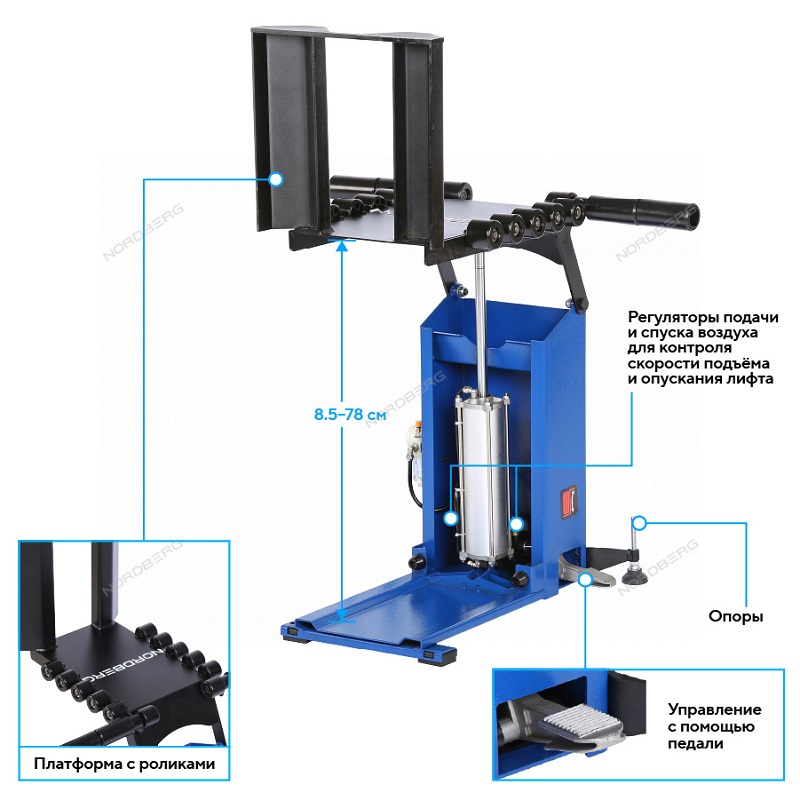 NORDBERG NTL21 — пневматический лифт для подъёма колёс. Применяется в автосервисах и шиномонтажных мастерских для облегчения монтажа и демонтажа шин.