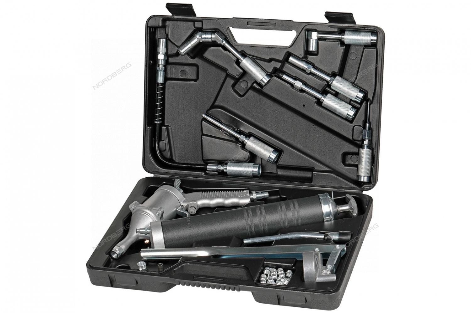 Шприц плунжерный пневматический с поворотом рукоятки, 400 мл, с насадками в кейсе Nordberg NO3404