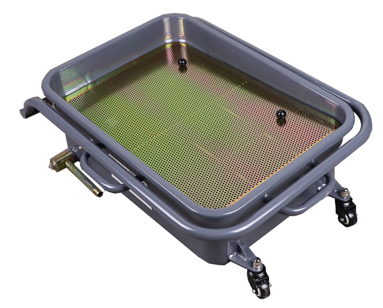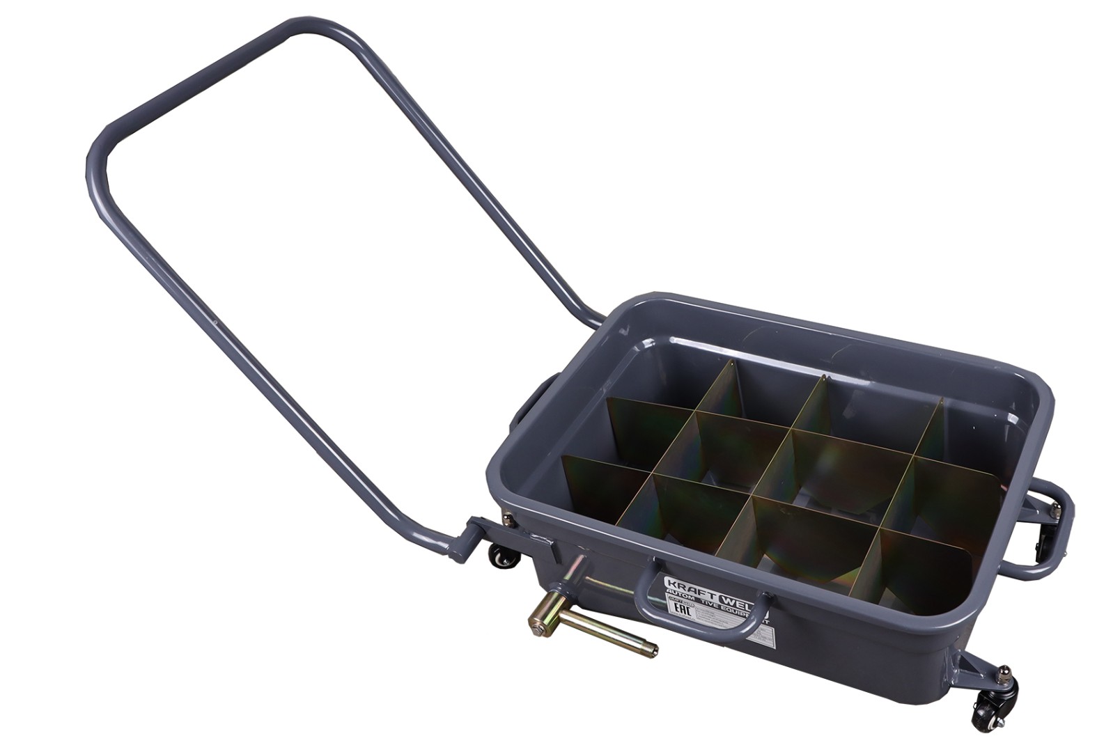 Емкость для сбора отработанного масла и других технических жидкостей KRAFTWELL, модель KRW1851 оснащена четырьмя поворотными колесами для перемещения по ровной горизонтальной поверхности и удобной рукояткой.