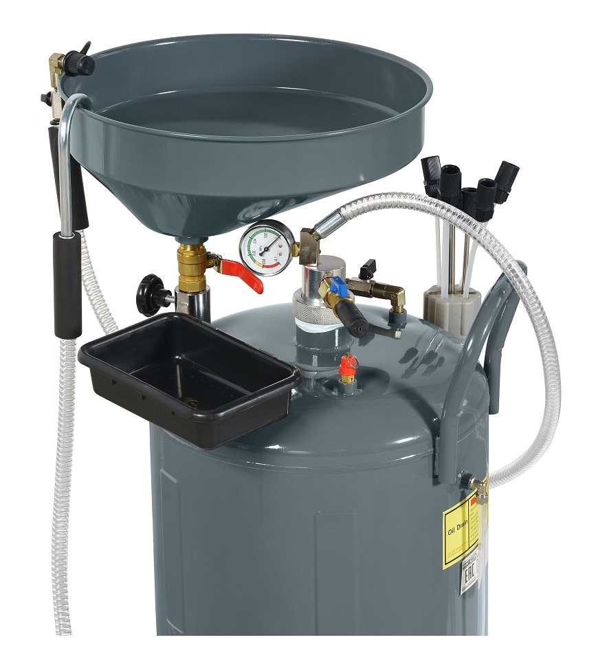 Установка KRAFTWELL, модель KRW1832.80L предназначена для сбора масла, антифриза и других технических жидкостей методом слива самотеком, а также откачкой через щупы. Высота приемной ванны регулируется позволяя точно подобрать удобное положение при работе, а также защитить от разбрызгивания масла. У основания приемной ванны расположен шаровый кран, перекрывающий слив жидкости в основную емкость до контроля ее состояния. Процедура откачки технических жидкостей через щупы основана на принципе вакуумирования, при котором создается разряжение и жидкость засасывается в емкость, и используется в тех случаях, когда слив невозможен. В комплекте с установкой поставляется набор из 6 щупов различной длины и материала. Индикатор уровня, расположенный на емкости, показывает ее наполненность и вовремя сигнализирует о необходимости опустошения. Для слива жидкости из установки необходимо подключить сжатый воздух к штуцеру, расположенному в верхней части емкости. Под давлением вся жидкость выливается через гибкий шланг с жестким наконечником в емкость большего объема и затем утилизируется. Давление воздуха контролируется по манометру. Для безопасности на корпусе установлен клапан избыточного давления, который предохраняет стенки от деформации и разрушения.