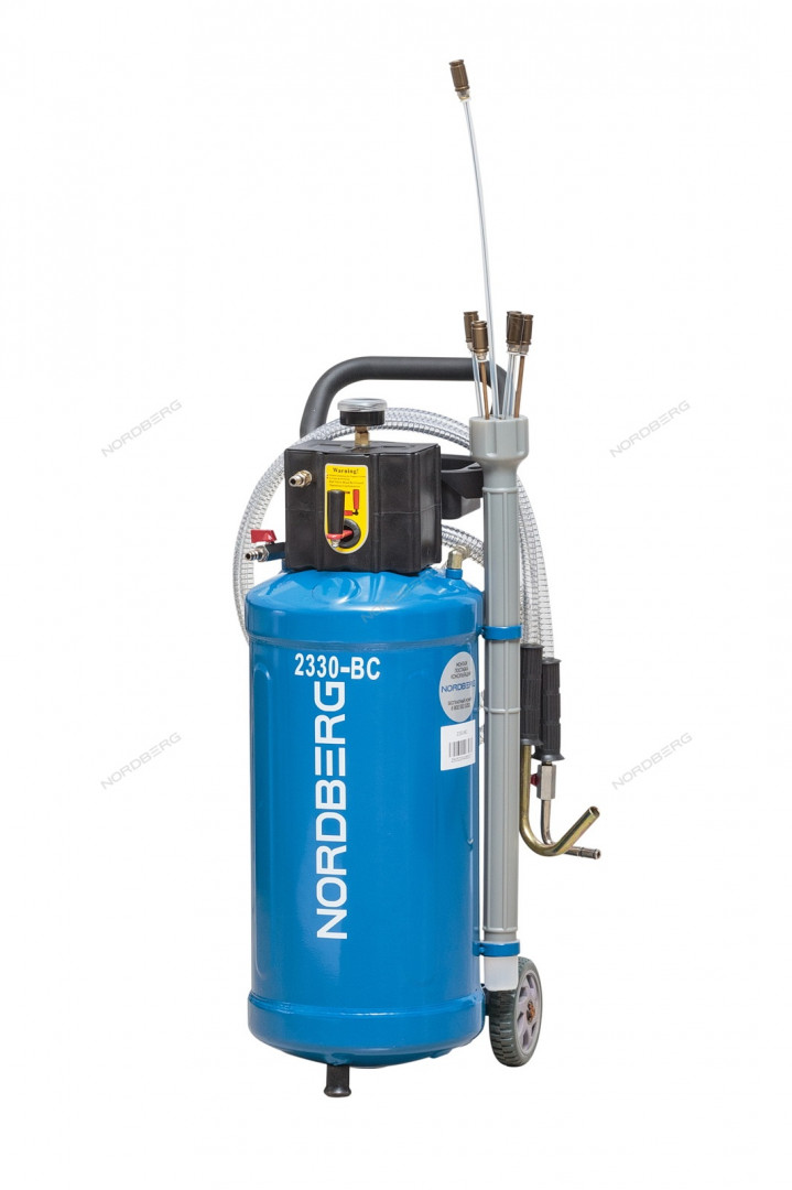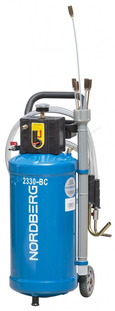 Компактная, маневренная и простая в эксплуатации установка для замены масла NORDBERG (2330-BC) 2330B удаляет отработанное масло и другие жидкости из любого транспортного средства при помощи вентури-вакуумной вытяжной системы.
