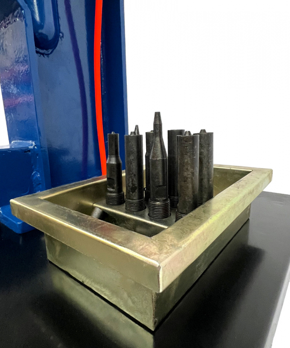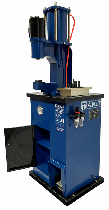 Клепальный станок используется для работы с различными видами и формами заклепок, изготовленных из меди и алюминия. Требуется подключение к компрессору. Рабочее усилие клепальный станок развивает с помощью сжатого воздуха и гидравлики. (давления воздуха регулируется с помощью редуктора). Создает давление для клепания с помощью гидравлического цилиндра. Сжатый воздух используется в качестве привода для гидравлического насоса. Что обеспечивает более плавный и стабильный ход штока.