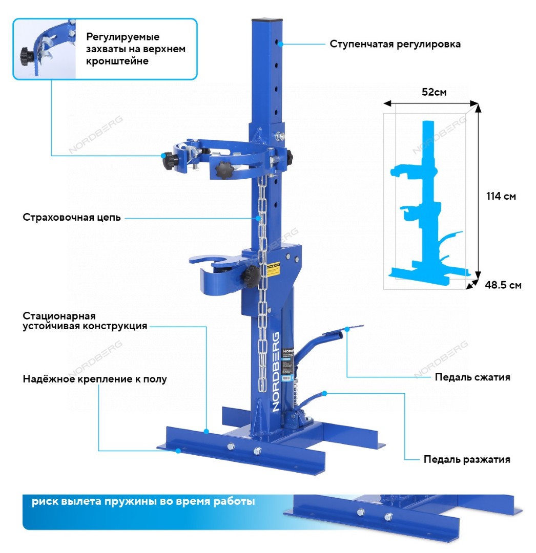 - Максимальное усилие сжатия до 1 т обеспечивает надежную фиксацию пружин различных размеров;