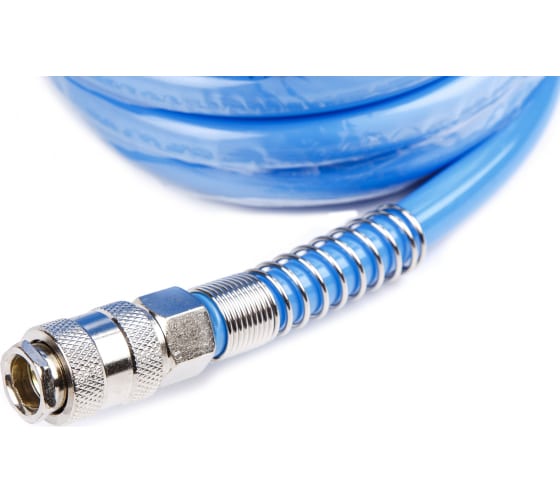Полиуретановый спиральный шланг применяется для подачи воздуха от компрессора или линии сжатого воздуха к пневмоинструменту. За счет своей формы в виде спрали, шланг имеет достаточно компактный размер и не мешается под ногами. Как следствие - минимальный риск падения персонала. При этом, в растянутом виде шланг имеет длину 15 м, что позволяет комфортно работать с пневмоинструментом. С двух сторон шланг оснащен резьбовыми наконечниками для подключения быстросъемных соединений.