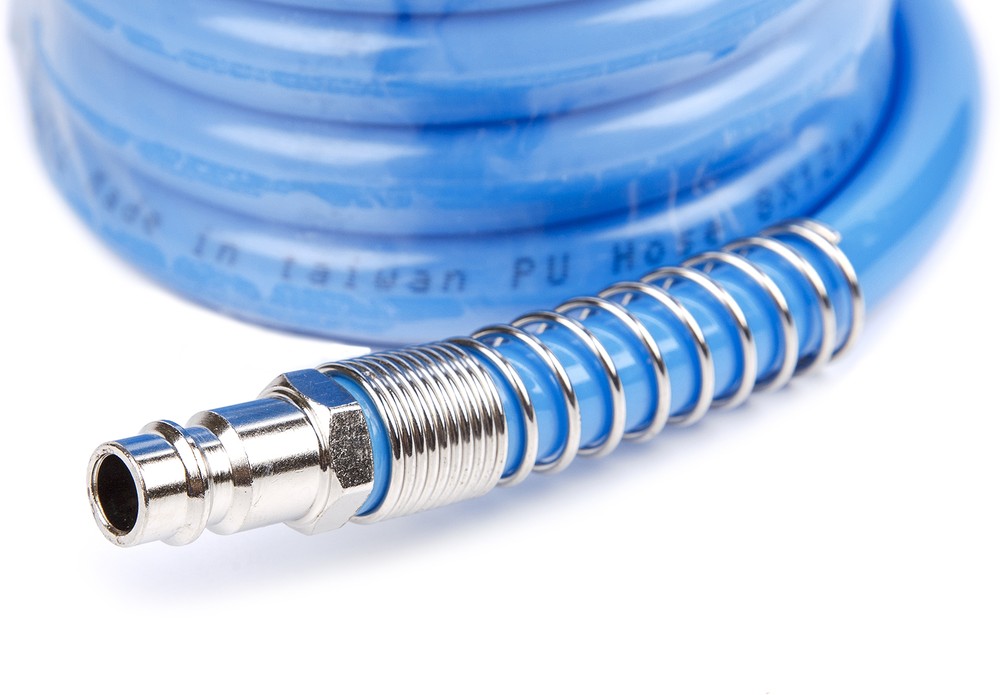 Полиуретановый спиральный шланг применяется для подачи воздуха от компрессора или линии сжатого воздуха к пневмоинструменту. За счет своей формы в виде спирали, шланг имеет достаточно компактный размер и не мешается под ногами. Как следствие - минимальный риск падения персонала. При этом, в растянутом виде шланг имеет длину 10 м, что позволяет комфортно работать с пневмоинструментом. С двух сторон шланг оснащен резьбовыми наконечниками для подключения быстросъемных соединений.