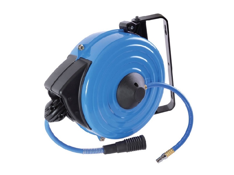 Шланг размещён на автоматической катушке закрытого типа. Конструкция автоматической катушки позволяет установить шланг на рабочем месте, закрепив его посредством кронштейна на стене, верстаке или другом любом неподвижном предмете, таким образом, чтобы при необходимости использования шланга, катушка всегда была под рукой.Фиксатор пружинного механизма катушки позволит зафиксировать шланг на необходимой длине, а по окончании работы поможет свернуть шланг обратно.