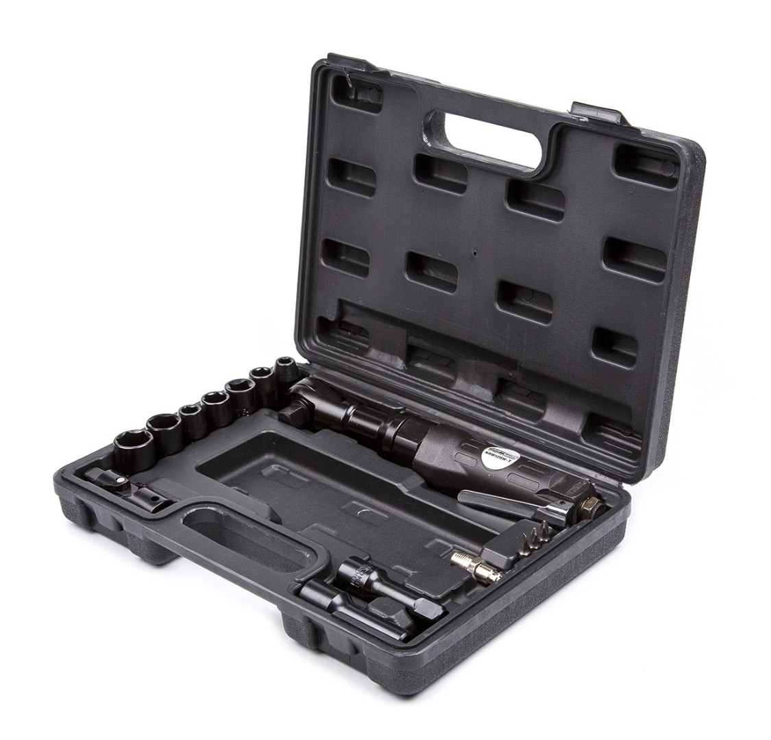 Трещотка пневматическая KRW12RW-T с набором головок предназначена для облегчения монтажа/демонтажа различных элементов и узлов автомобиля. Имеет широкое применение в автосервисе. За счет работы от линии сжатого воздуха, достигается высокая скорость и эффективность работы. Рабочая головка имеет квадрат сечением 1/2" и расположена под углом 90 градусов к корпусу, что обеспечивает дополнительное удобство при работе в труднодоступных местах.