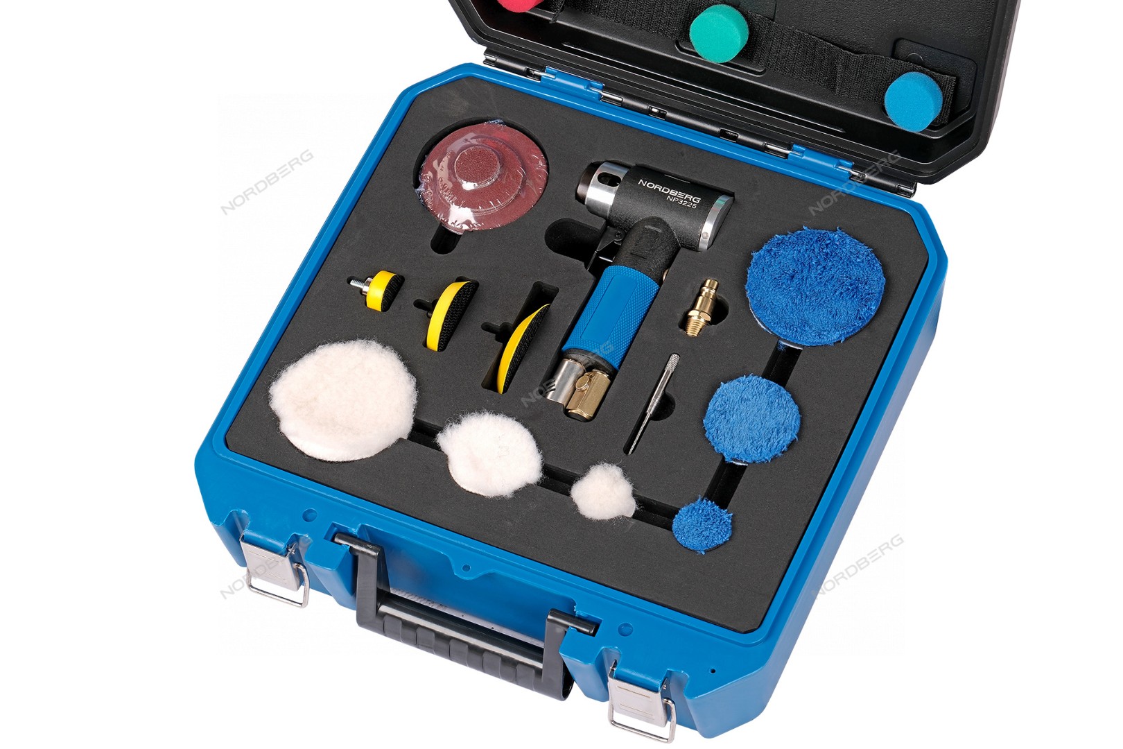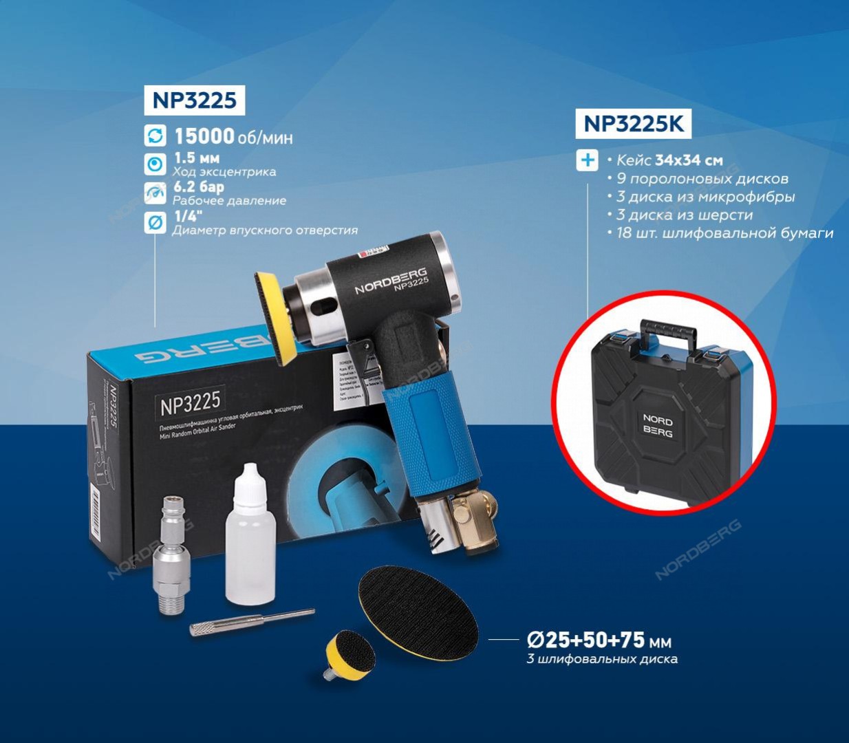 Пневмошлифмашинка угловая орбитальная, в комплекте с насадками, диам. 25,50,75 мм NP3225K Nordberg характеристики