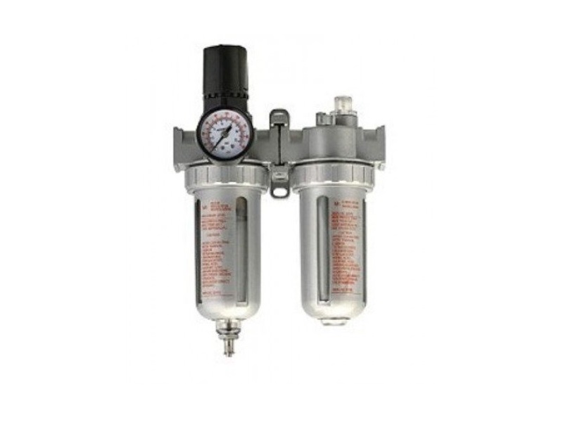 Фильтр-лубрикатор с регулятором давления и манометром. Фильтр обеспечивает подготовку воздуха для пневматического инструмента и устройств с пневматическим приводом.