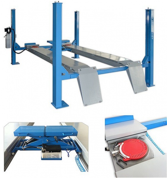 Электрогидравлический подъемник с комплектом для "развал-схождения" для обслуживания легковых автомобилей и легких грузовиков.