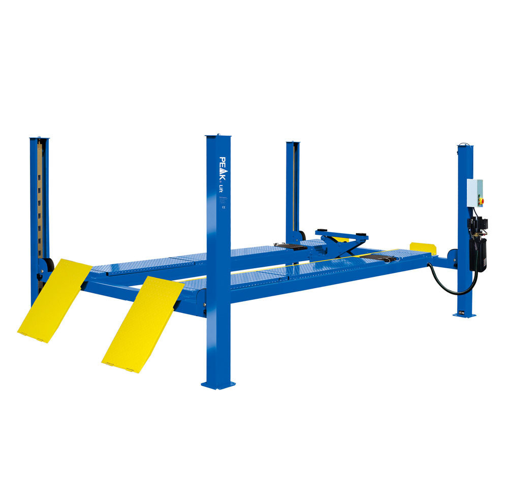 PEAK 412A четырехстоечный электрогидравлической подъемник с платформами для сход-развала и грузоподъемностью 5,5 тонн. Подходит для работы со всеми стендами сход-развала 3D и датчиковыми. В комплект входят задние сдвижные платформы. Оснащен стопорами с пневматическим управлением. Длина платформ 5100 мм без трапов.