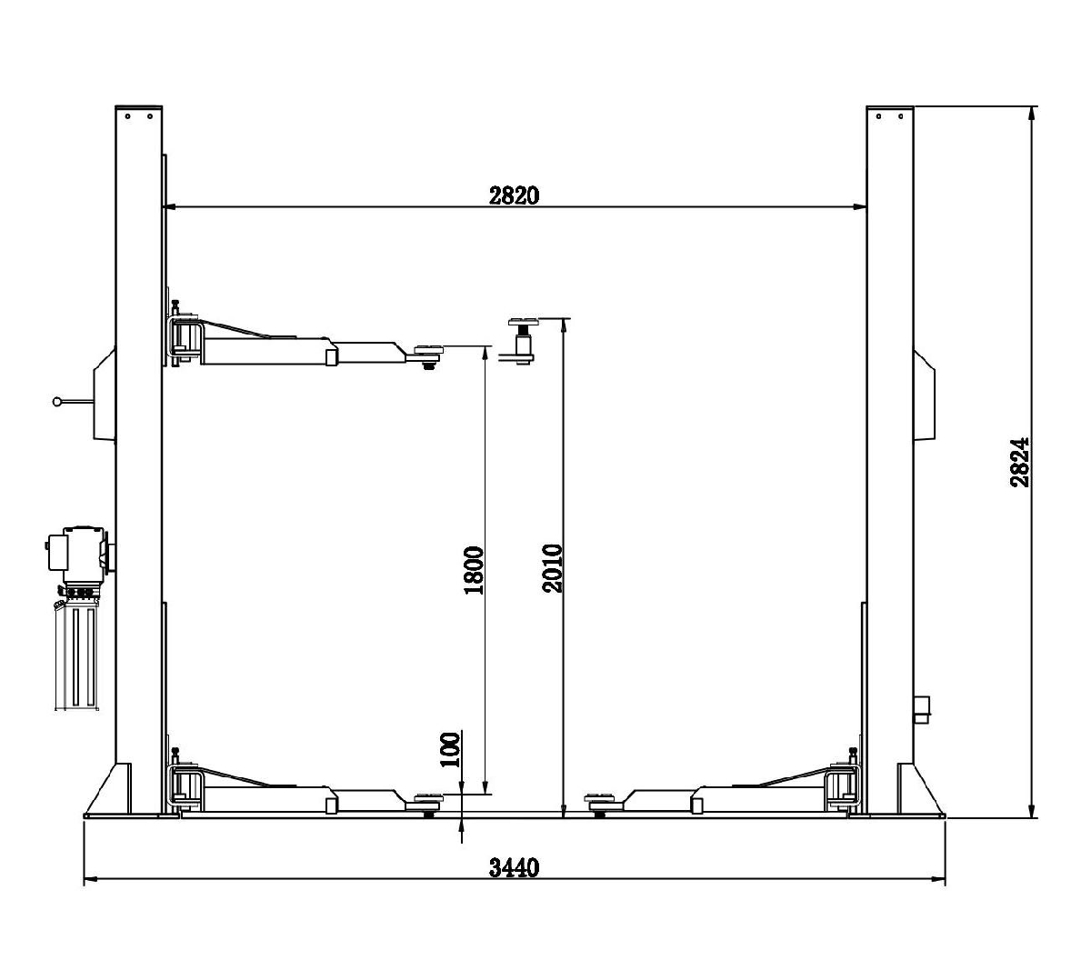 Подъемник двухстоечный электрогидравлический с управлением стопорами на одной колонне, асимметричный, двухцилиндровый, г/п 4000 кг., 2,2 кВт, высота подъема 2010 мм., расстояние между стойками 2820 мм., с нижней синхронизацией.
