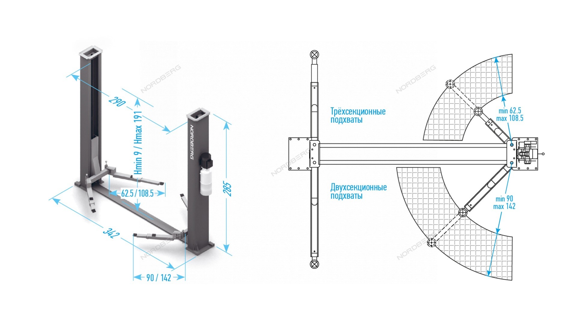 Электрогидравлический двухстоечный подъемник г/п 4 т. электростопора Nordberg N4120BE-4G_3+2_380 характеристики