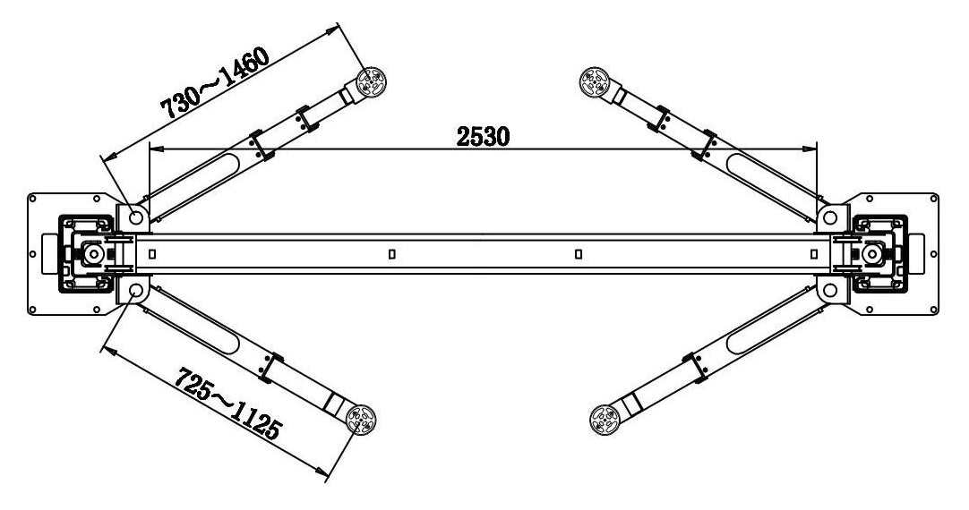 Двухстоечный электрогидравлический подъемник с верхней синхронизацией KRAFTWELL VERSA 2B оснащается каретками с лапами, расположенными внутри каретки. Зубчатые сегменты, предотвращающие поворот лап в поднятом состоянии, так же находятся внутри. Короткие трехсекционные лапы имеют длину 725-1125 мм, длинные двухсекционные - 730-1460 мм.