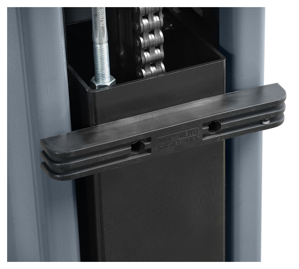 Двухстоечный электрогидравлический подъемник с нижней синхронизацией KRAFTWELL грузоподъемностью 4000 кг предназначен для подъема легковых автомобилей, внедорожников и легкого коммерческого транспорта с короткой колесной базой. За подъем автомобиля отвечают два гидравлических цилиндра с цепным приводом каретки. Такой тип привода уменьшает нагрузку на гидроцилиндры и обеспечивает долговечность их работы. Внутри колонн расположены каретки с поворотными лапами асимметричной конструкции, применяемые на подъемниках для американского рынка. Каретки снабжены нейлоновыми ползунами, обеспечивающими плавное перемещение внутри стоек. Простая и, в тоже время, надежная система механических стопоров со снятием с двух сторон обеспечивает безопасное удержание автомобиля в поднятом состоянии на протяжении всего времени ремонта. Габаритная высота подъемника составляет 2814 мм и позволяет устанавливать его в помещениях с высотой потолка от 3 метров и выше.