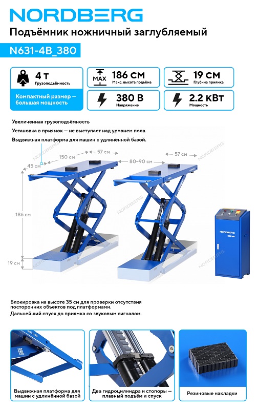 Ножничный подъемник г/п 4 т, 380 В, синий Nordberg N631-4B_380 характеристики