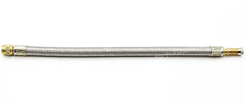 Резиновый шланг удлинителя армирован внутри синтетической нитью, что увеличивает его прочность, а снаружи имеет металлическую оплётку, которая дополнительно защищает его от повреждения и истирания.