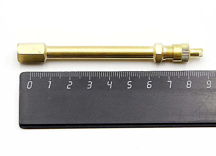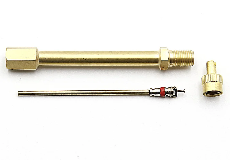 Удлинитель состоит из латунного корпуса, колпачка со шлицем под отвёртку и высокотемпературного золотника с длинным штоком, который нажимает при подкачке колеса на золотник вентиля.