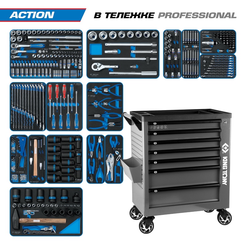 Набор инструментов 327 предметов, "action", в серой тележке king tony 9g38-327mrvg характеристики