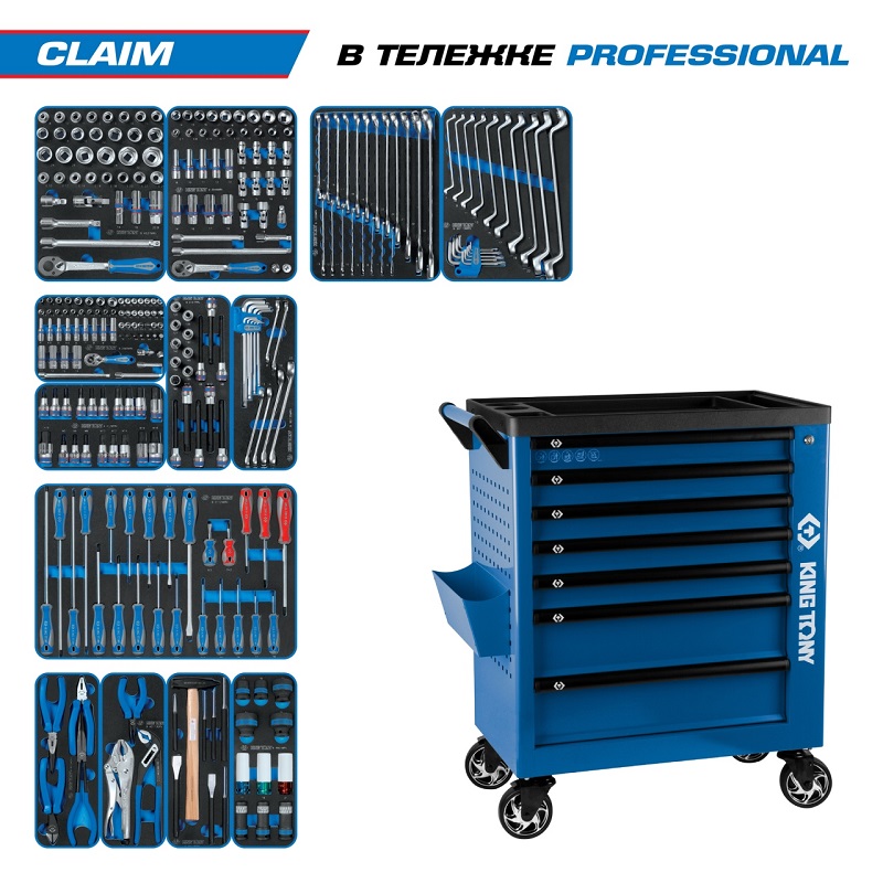 Набор инструментов 286 предметов, "claim", в синей тележке king tony 9g38-286mrvb характеристики