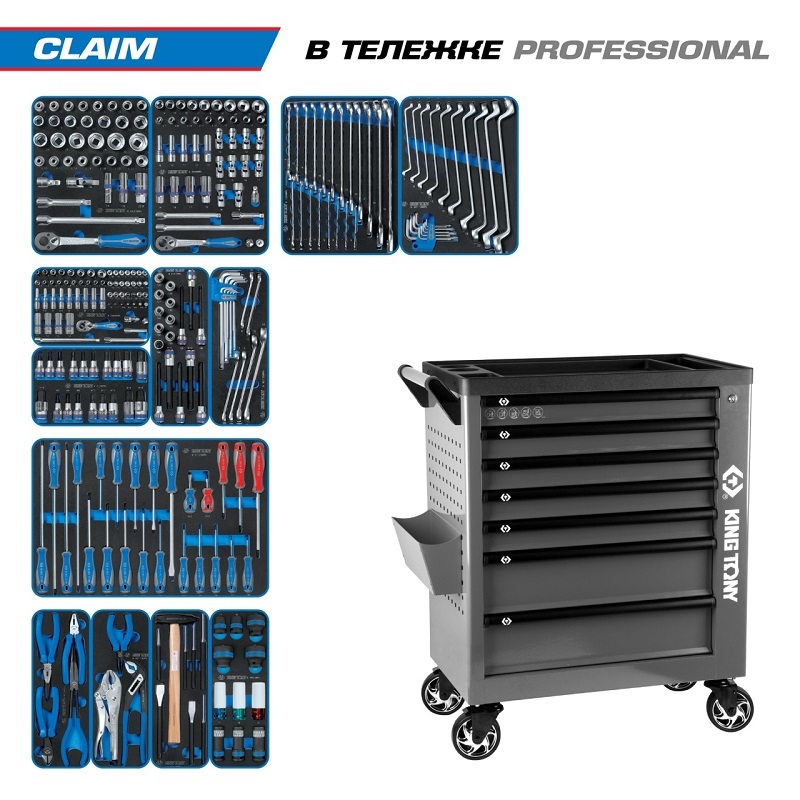 Набор инструментов 286 предметов, "claim", в серой тележке king tony 9g38-286mrvg характеристики