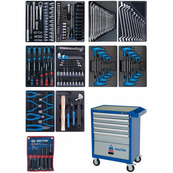 Набор с инструментов торговой марки KING TONY состоит из 173-х предметов и включает в себя 10 ложементов и набор выколоток в чехле из винила.