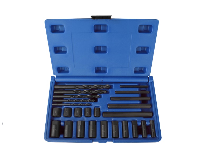 Комплектация набора включает свёрла и экстракторы для извлечения обломанных шпилек: высверливается отверстие и с помощью соответствующего экстрактора извлекается остаток. Для того, чтобы точно по центру высверлить отверстие в шпильке, в наборе присутствуют специальные центрирующие муфты.