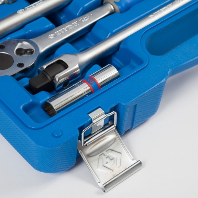 Инструменты дюймовые для ремонта автомобилей в чемодане отличаются повышенной надежностью, высоким качеством изготовления, особой прочностью и удобством применения. На ключи, торцевые головки и другой силовой инструмент распространяется пожизненная гарантия, что даёт возможность применения инструмента Кинг Тони при интенсивной эксплуатации в профессиональных сферах деятельности. Кейс изготовлен из крепкого ABS-пластика и оснащен металлическими замками с фиксаторами типа CLIP-LOCK.