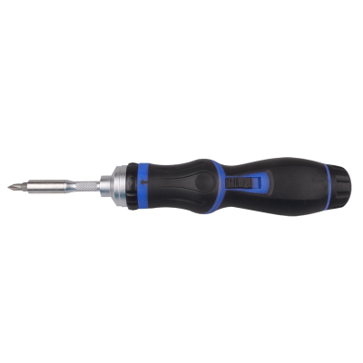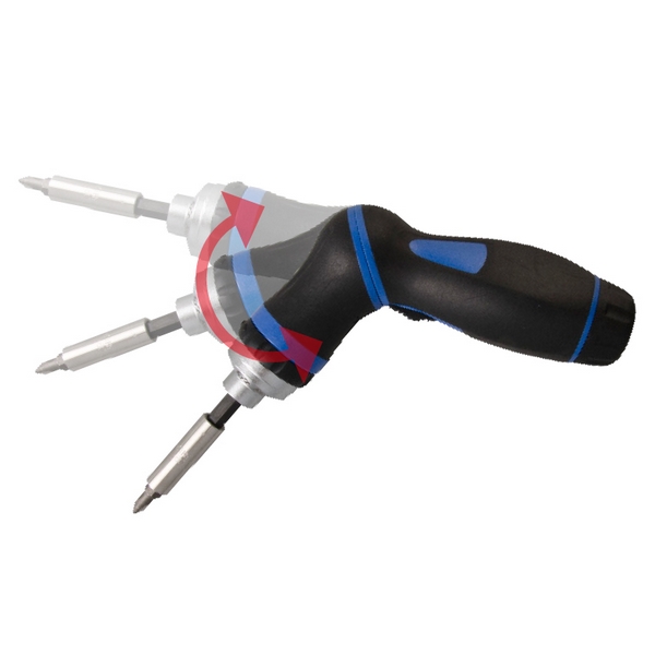 Прочная и удобная рукоятка отвертки изготовлена из двухкомпонентного материала (пластика PC и термопластичной резины TPR), имеет профилированную форму под надежный хват рукой. Особенности инструмента: механизм складывания может придать отвертке L-образную форму, сменные биты хранятся в корпусе инструмента на съемном держателе, трещоточный механизм с 46 зубцами наделяет отвертку функциями вращения вперед, реверса и блокировки.