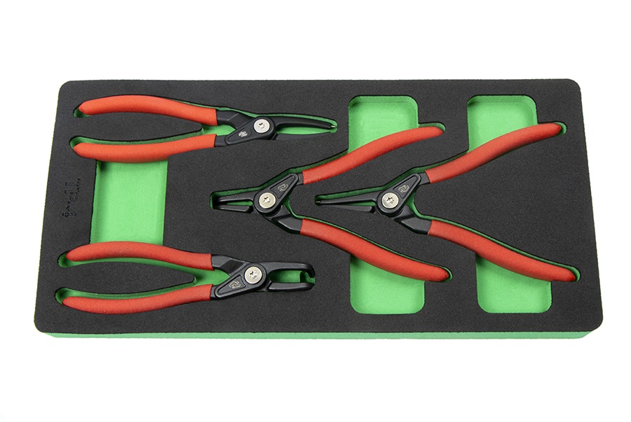 Съемники стопорных колец Станкоимпорт ложемент TP-4 помещены в удобный ложемент, который изготовлен из EVA (этилен винил ацетат) пены. Данный материал обладает высокой стойкостью к агрессивным средам и механическим воздействиям. Съемники имеют твердосплавные вставки, которые обеспечивают высокие показатели прочности, надежности удержания стопорного кольца и долгий срок службы. Наличие возвратной пружины скрытого типа облегчает позиционирование инструмента.