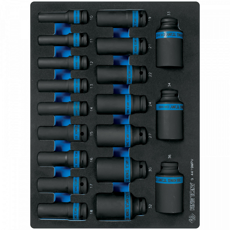 Набор ударных глубоких торцевых головок 1/2, шестигранные, 10-36 мм, ложемент, 19 пр. KING TONY 9-4419MPV