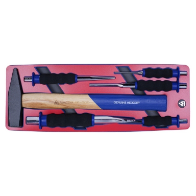 Набор инструментов 6 предметов молоток, зубила, выколотки, кернер Мастак 5-9006 в ложементе из материала EVA предназначен для комплектации передвижных инструментальных тележек или слесарных верстаков при создании индивидуальных рабочих мест на станциях технического обслуживания автомобилей и других предприятиях, занимающихся обслуживанием и ремонтом различной техники.