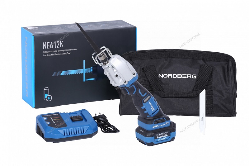 Сабельная пила аккумуляторная мини NORDBERG NE612K – универсальный режущий инструмент для выполнения ремонтных и строительных работ в автомастерских, СТО, производственных предприятиях и для бытового использования.
