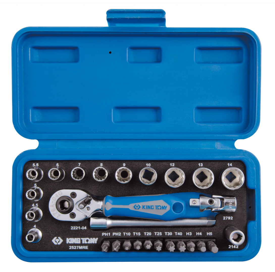 Набор торцевых головок с принадлежностями 1/4, двенадц-е, 4-14 мм, 27 пр. KING TONY 2027MRE характеристики