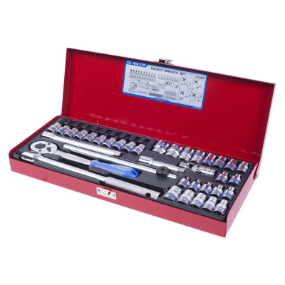 Набор профессионального слесарного ручного инструмента King Tony 3534MR с присоединительным квадратом 3/8 дюйма включает в себя 10 коротких шестигранных торцевых головок с рабочими размерами от 6 до 19 мм, 10 торцевых головок E-типа с рабочими размерами от E4 до E18, 10 торцевых головок со вставками 50 мм размерностью от T8 до T45, а также аксессуары (всё вместе – 34 предмета), размещённые в металлическом кейсе с габаритами 372x153x40 мм.