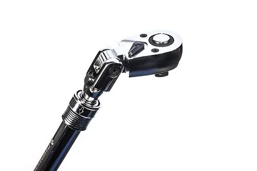 Трещотка изготовлена из высококачественной легированной хром-ванадиевой инструментальной стали, с последующей закалкой до твердости в пределах 46-48HRC, что обеспечивает оптимальное соотношение прочности и твердости. Наличие шарнирной трещоточной части позволяет изменять угол подвода инструмента в пределах 180 градусов, что в свою очередь, существенно упрощает работы в условиях ограниченного пространства. Шарнир снабжен кнопочным фиксатором, обеспечивающим надежное удержание трещотки в промежуточном положении. Телескопическая конструкция позволяет добрать до труднодоступных мест. Эргономичная рукоять обеспечивает надежное удержание инструмента и комфортную работу, а благодаря высококачественным компонентам рукоять обладает высокой стойкостью к агрессивным средам.